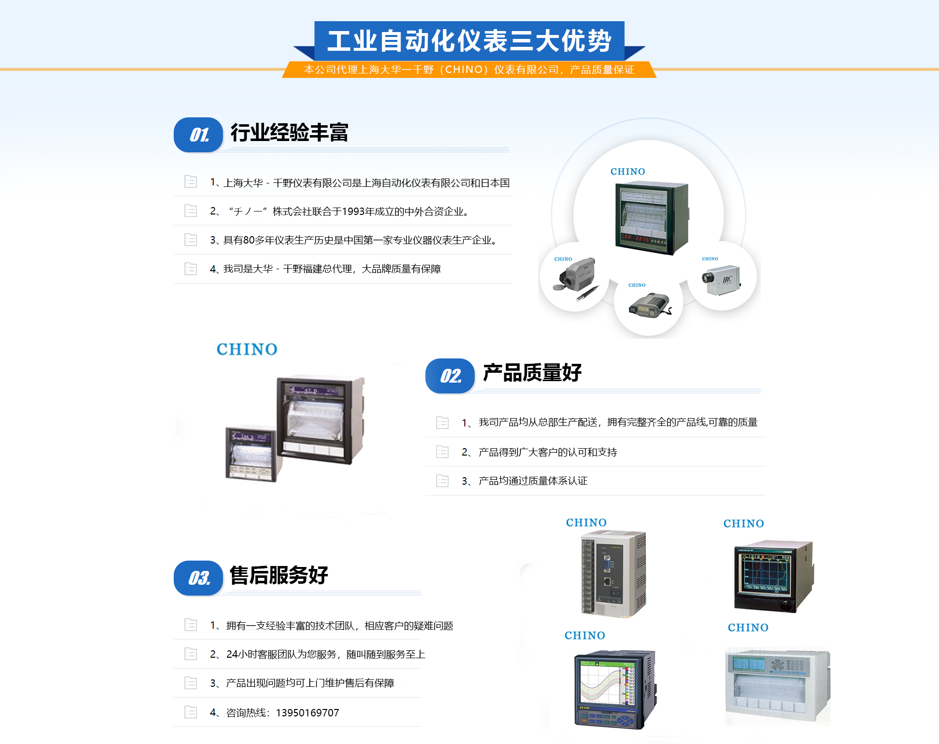 本公司是上海自動(dòng)化儀表有限公司及上海大華一千野(CHINO)儀表有限公司(福建省總代理),主要經(jīng)營(yíng)工業(yè)自動(dòng)化儀表,溫濕度傳感器和記錄儀,兼營(yíng)進(jìn)口、國產(chǎn)各種品牌的儀器儀表,主要產(chǎn)品以溫度系統的配置為主,確保價(jià)格、質(zhì)量及售后服務(wù)均以用戶(hù)為宗旨。具體產(chǎn)品介紹如下:一、記錄儀、巡檢儀、顯示儀: 1、千野(CHINO)記錄儀、橫河(YOKOGAWA)記錄儀、圓圖記錄儀、長(cháng)圖記錄儀、實(shí)驗室記錄儀及記錄紙。 2、巡檢儀、數顯儀、指示儀、指示報警儀、閃光報警器,及相關(guān)的備品備件。 二、溫度傳感器和溫度控制器: 1、熱電阻、熱電偶:如WZP-120,WZPK-230,WRS-230等; 2、雙金屬溫度計:如WSS-401,WSS-501等. 3、各種分度號的補償導線(xiàn). 4、各種品牌的溫度控制調節儀:如千野(CHINO)、RKC、 橫河(YOKOGAWA)、山武-霍尼韋爾等。 三、壓力儀表: 1、壓力表、壓力傳感器; 2、各類(lèi)差壓、壓力變送器(橫河EJA,??怂共_,羅斯蒙特,上海光華及重慶偉岸等品牌產(chǎn)品...